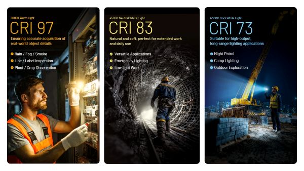 🌈 แสงสามโทนสี (Multiple Color Temperatures) • 🌡️ 3000 K – Warm Light (CRI 97): เหมาะกับการมองสีจริงของวัตถุและใช้งานใกล้ ๆ • 🌡️ 4500 K – Neutral White (CRI 83): แสงธรรมชาติ ใช้งานทั่วไป • 🌡️ 6500 K – Cool White (CRI 73): แสงสว่างไกล เหมาะกลางแจ้ง