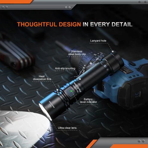 🔦 สเปคหลัก • ความสว่างสูงสุด: 1,200 ลูเมน • ระยะส่องไกล: ประมาณ 170 เมตร • หลอด LED: Cree LED (อายุการใช้งาน ~50,000 ชั่วโมง) • แบตเตอรี่: 21700 Li-ion (ชาร์จในตัว) • พอร์ตชาร์จ: USB-C • กันน้ำ: มาตรฐาน IP68 (กันน้ำลึก ~2 เมตร) • กันกระแทก: สูง ~1.5–2 เมตร